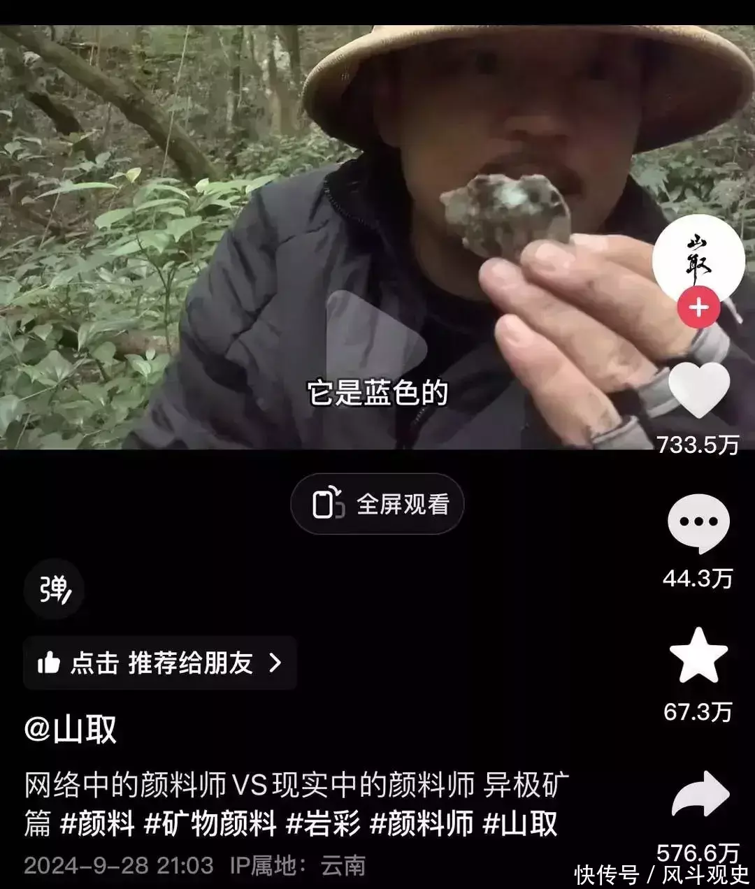 略带恐怖的画面,稍显惊悚的背景音乐,险象环生的取材经历……“山取”独自进哀牢山寻找矿物颜料的视频在网络走红,也因此引发热议。